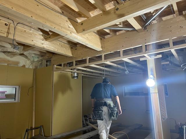 新 築 帯広市 H様邸 施工2025.09.20 天井下地組 大工工事は天井下地を作っている様子です。天井が少し下がっているところの真下がキッチンになります。外観もシートで隠れていますが、結構進んできました。 一覧へ戻る 工事概要へ戻る