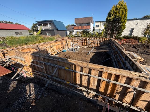 新 築 芽室町 K様邸 施工2025.09.24 基礎型枠工事 基礎型枠のパネルの組み立てが完成したので、囲んだ枠の中にコンクリートを流し込みました。あとはコンクリートが固まれば木の枠を外していきます。 一覧へ戻る 工事概要へ戻る