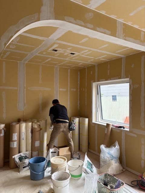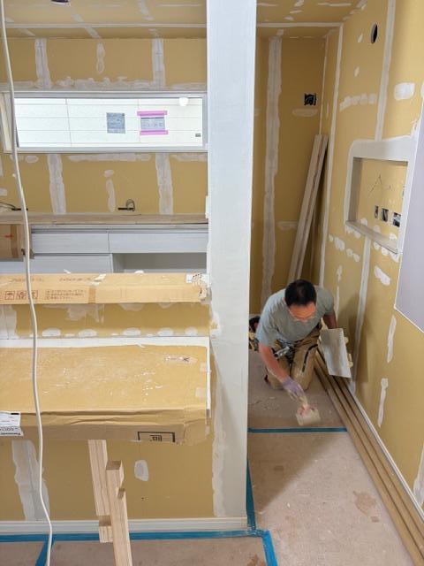 新 築 帯広市 H様邸 施工2025.10.14 クロス工事 クロス工事が始まりました。まずはクロスを貼る前の下地処理をしていきます。下地材を塗って乾いたらやすりをかけ、壁を平らにしてからクロスを貼っていきます。 一覧へ戻る 工事概要へ戻る