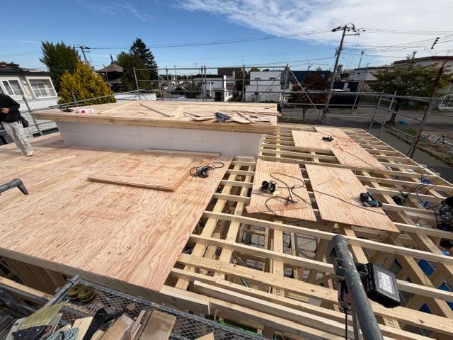 新 築 芽室町 K様邸 施工2025.10.14 屋根下地 あっという間に屋根工事に入りました。まずは下地貼り中です。それから板金屋さんが防水シートを貼っていきます。屋根の飛び出ている所はFASの機械が入る機械室です。 一覧へ戻る 工事概要へ戻る