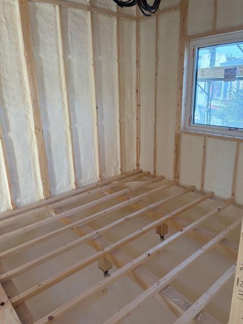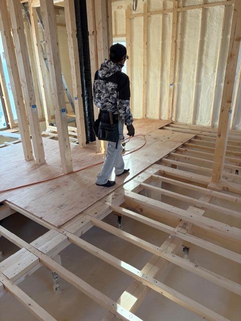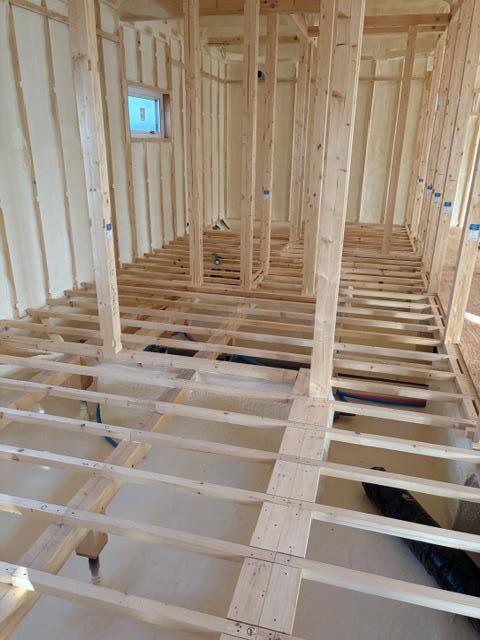 新 築 幕別町 S様邸 施工2025.11.07 ウレタン工事終了 ウレタン工事が終了しました。内部はモコモコ、これで夏も冬も快適です。お家が魔法瓶状態になり断熱効果もバッチリです。次は床下地の合板張りに進んでいきます。 一覧へ戻る 工事概要へ戻る