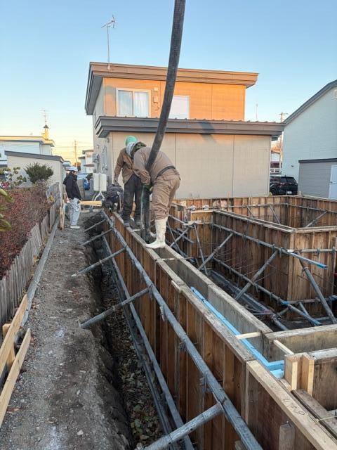 新 築 幕別町 H様邸 施工2025.11.12 基礎工事中 新しく工事が始まりました。基礎工事の型枠工事中の様子です。木のパネルで型枠を組立てて、その中にコンクリートを流し込んでいきます。コンクリートが固まればパネルを外します。 一覧へ戻る 工事概要へ戻る