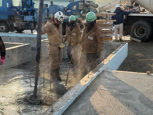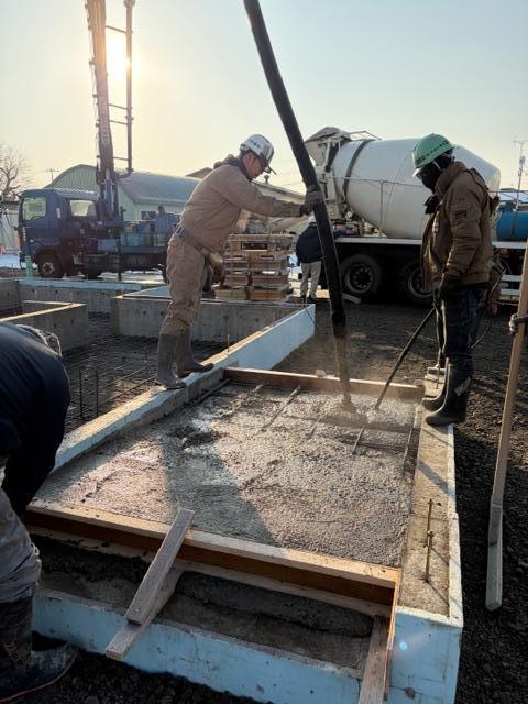 新 築 池田町 C様邸 施工2025.12.08 土間コンクリート 埋め戻しが終わり、その後の鉄筋組みも終わったので、土間コンクリート打設中です。コンクリートを流し込んだら職人さんたちがきれいに水平に均していきます。基礎工事も終わりに近づいてきました。 一覧へ戻る 工事概要へ戻る