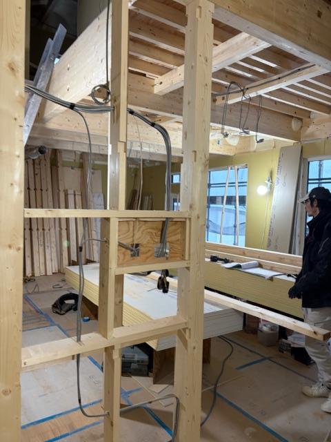 新 築 幕別町 H様邸 施工2026.01.29 大工工事中 最近は朝夜の寒さがちょっと和らいだ感じがしますね。大工工事も着々と進んでいます。現在はお部屋の間仕切りなどを作っている様子です。ユニットバスも設置が完了しました。 一覧へ戻る 工事概要へ戻る