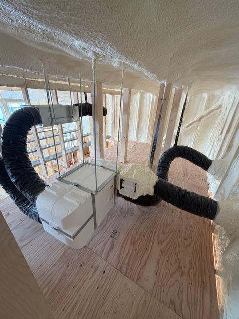 新 築 池田町 C様邸 施工2026.01.30 AIキット ウレタンの吹付けも終了し大工工事が進む中、AIキットの設置が始まりました。「AIキット」とは、ファース専用の健康空気循環システムです。天井裏で換気、床下で床下で調湿・清浄した空気を家全体に循環させていきます。 一覧へ戻る 工事概要へ戻る