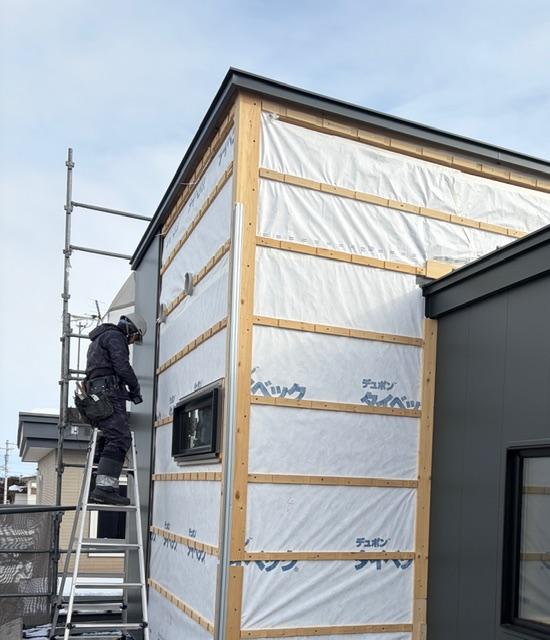 新 築 幕別町 H様邸 施工2026.02.02 外壁工事 外壁の下地が終わり、サイデイング貼りが始まりました。白いシートは透湿防水シートで、湿気は通すけど水は通さないシートです。その上に外壁材の下地を貼り、サイディングを貼っていきます。 一覧へ戻る 工事概要へ戻る