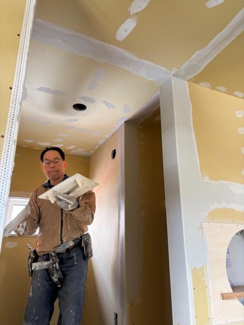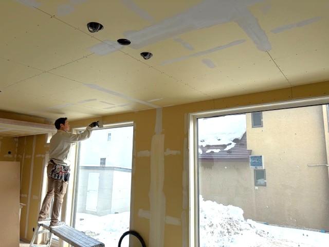 新 築 幕別町 H様邸 施工2026.03.06 クロス工事 クロス工事が始まりました。まずはクロスを貼る前に下地処理をしていきます。下地材を塗って乾いたらやすりをかけ、壁を平らにしてからクロスを貼っていきます。 一覧へ戻る 工事概要へ戻る